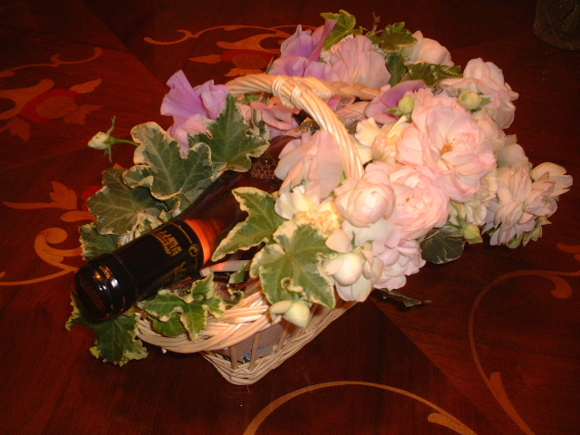 机の上にアレンジのお花と一緒にロゼワインが。。。