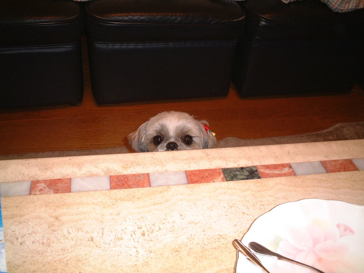 食いしん坊チャッピーはテーブルのお菓子を狙っています。